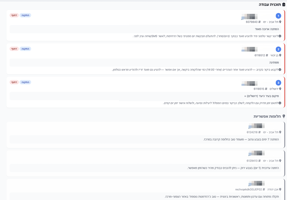 בניתי ממשק ייעודי לניהול הלו"ז. המשתמש מזין "עיר עוגן" (למשל: ירושלים) ותאריך יעד. המערכת סורקת מיידית את כל המאגרים של החברה ומציגה תוכנית עבודה אופטימלית שכוללת: התקנות חדשות, תקלות שירות פתוחות, ואפילו משלוחים. הבונוס הכלכלי: המערכת בודקת גם הזמנות של מוצרים (סננים/חלפים) שצריכים להישלח לאותו אזור. אם הטכנאי כבר שם? הוא מבצע את המסירה. חסכנו חברת שליחויות, והלקוח קיבל את המוצר מהר מהצפוי.